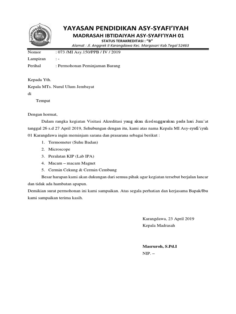 001/book/as 2008 b/2009 16 november 2009 lamp : Pt medika yana melati kantoraisai ruko mutiara melania jl. Contoh surat peminjaman barang inventaris kantor resmi untuk peminjaman barang seperti laptop bagi karyawan internal ataupun eksternal. 16 contoh surat pesanan barang terbaru dan terlengkap contoh surat. Oleh sebab itu, penting bagi anda yang berkutat di bidang penjualan, distribusi dan sebagainya untuk mengetahui contoh surat serah terima … Contoh prosedur peminjaman alat/laboratorium 1. Contoh surat peminjaman diajukan oleh himpunan mahasiswa islam. Setiap mahasiswa yang melakukan peminjaman alat harus tercatat dan menyerahkan kartu mahasiswa sebagai jaminan. Surat lamaran kerja untuk posisi di tim accounting contoh 5 : Download as txt, pdf, txt or read online from scribd. Hal tersebut bisa terlihat dari kop surat yang digunakan. Surat lamaran pekerjaan untuk mengisi kekosongan jabatan atau formasi surat lamaran kerja umum biasanya digunakan untuk melamar sebuah pekerjaan pada sekolah. Di dalam pembuatan surat ini, ada beberapa hal yang tidak boleh anda lewatkan, selain memperhatikan mengenai bahasa yang akan anda gunakan di dalam surat tersebut.